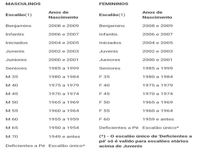 Os escalões etários são os mencionados, de acordo com os regulamentos atualmente em vigor: