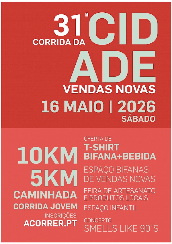 Realiza-se no dia 16 de Maio de 2026, a 31ª edição da Corrida da Cidade de Vendas Novas.