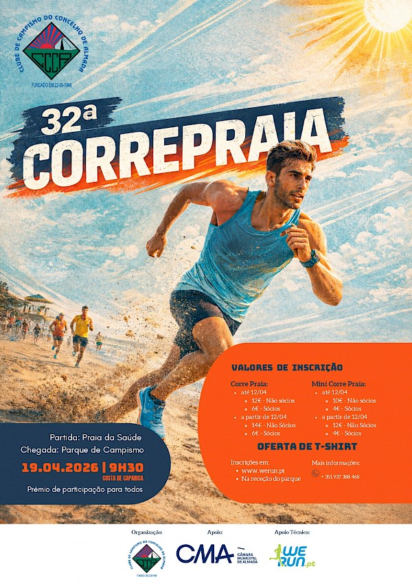 A Área de Gestão Desportiva do Clube de Campismo do Concelho de Almada, irá realizar no próximo dia 19 de Abril de 2026, pelas 9h30 o CORREPRAIA, num percurso compreendido entre a Praia da Saúde, Fonte da Telha, Praia da Saúde num total de 15km.