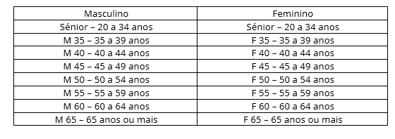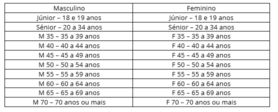 Os escalões juniores e seniores são considerados em relação ao ano civil em que os atletas atingem as idades estipuladas. Para os atletas veteranos a mudança de categoria efetuar‐se‐á no dia em que o atleta perfaz a idade: