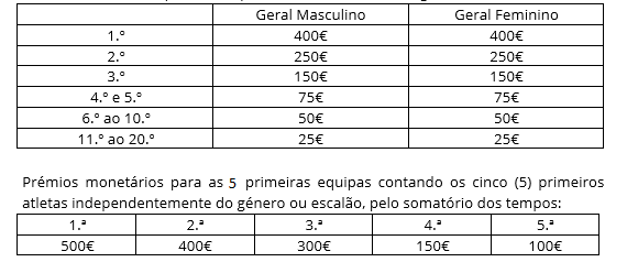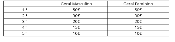 Prémios monetários para os 5 primeiros classificados da geral (m / f).